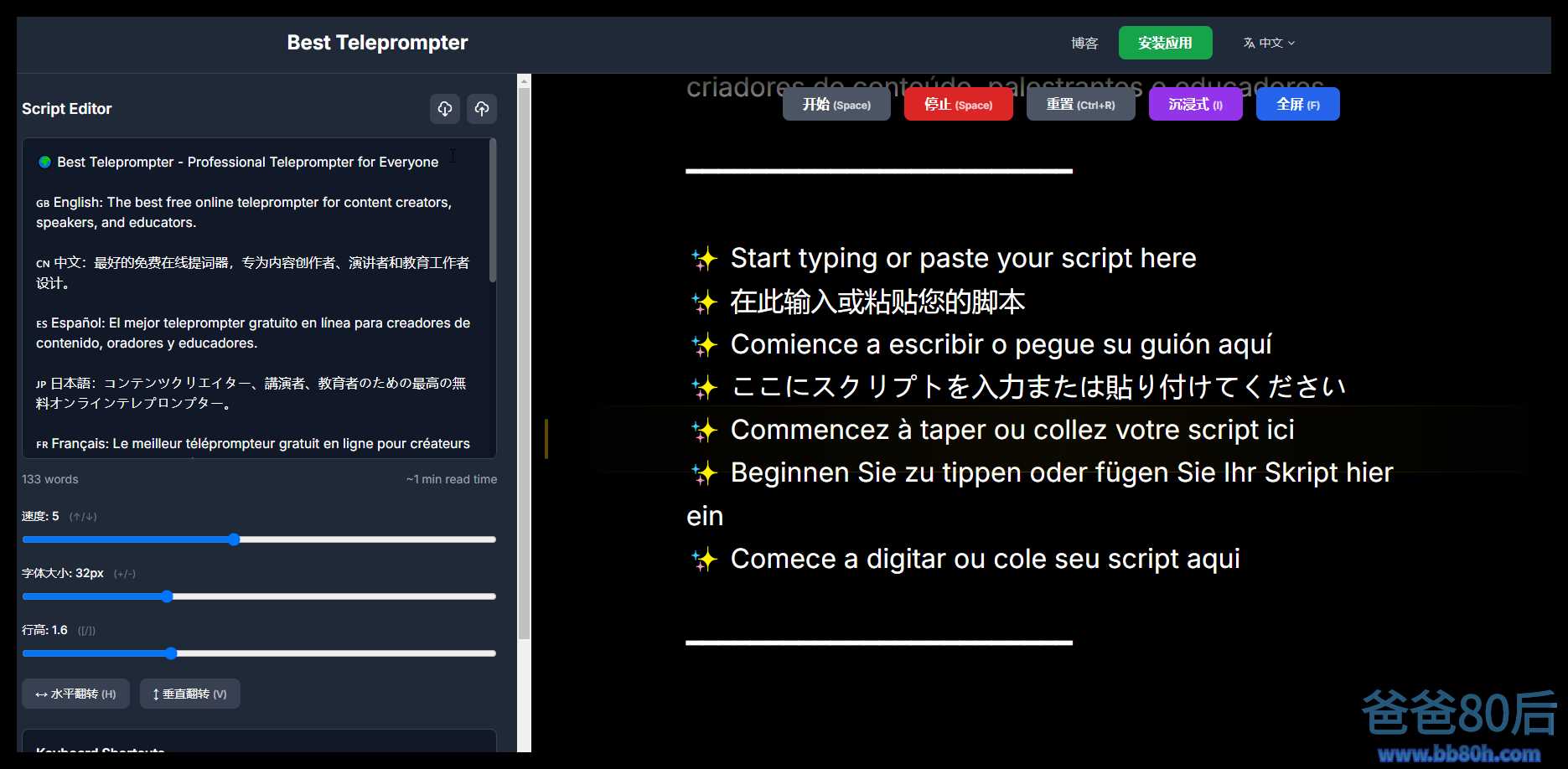 在线提词器,支持实时调整滚动速度、字体大小和行高,还可水平或垂直翻转文本,满足不同设备和镜像需求,提供一系列快捷键(如:Space 启停、↑/↓调速、+/-调字号、[/]调行距、H/V 翻转、F 全屏、I 沉浸模式),完全免费,无需注册,支持 PWA 版本。 声明:本站所有文章,如无特殊说明或标注,均为本站原创发布。任何个人或组织,在未征得本站同意时,禁止复制、盗用、采集、发布本站内容到任何网站、书籍等各类媒体平台。如若本站内容侵犯了原著者的合法权益,可联系我们进行处理。