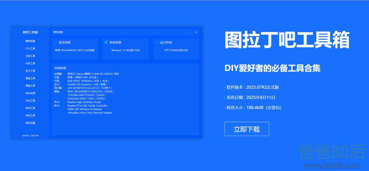 图吧工具箱,是开源、免费、绿色、纯净的硬件检测工具合集,专为所有计算机硬件极客、DIY爱好者、各路大神及小白制作。集成大量常见硬件检测、评分工具,一键下载、方便使用。