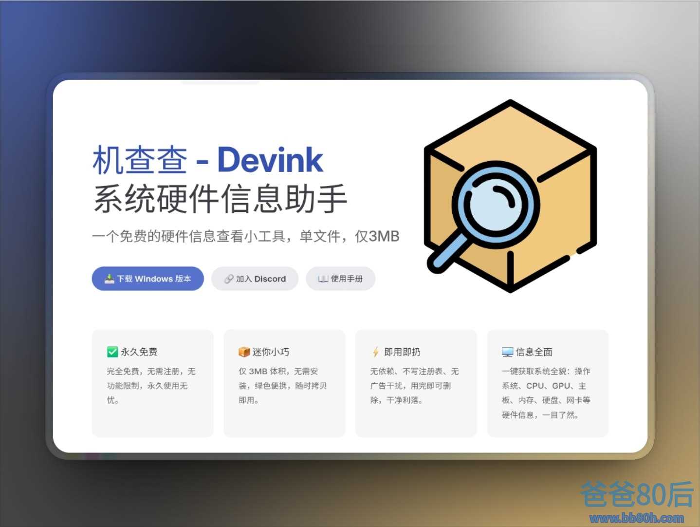 一个免费的硬件信息查看工具,体积仅 3MB,单文件绿色免安装,真正做到拷贝即用。它不会写注册表,没有广告,也不捆绑任何依赖,用完即可删除,干净利落。