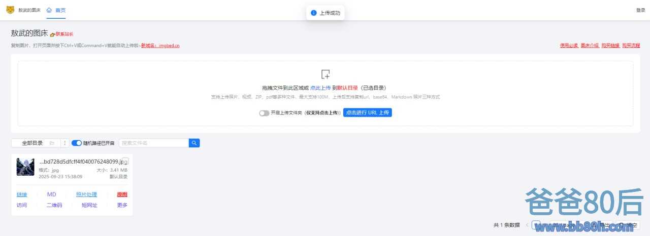 在线图床服务,支持上传照片、视频、ZIP、PDF 等文件,单个文件最大 100M,上传后可一键复制 URL、base64 或 Markdown 链接,免费使用,无需注册,由于支持的格式较多,更像是文件传输工具,文件存活时间不定,长期使用需谨慎。