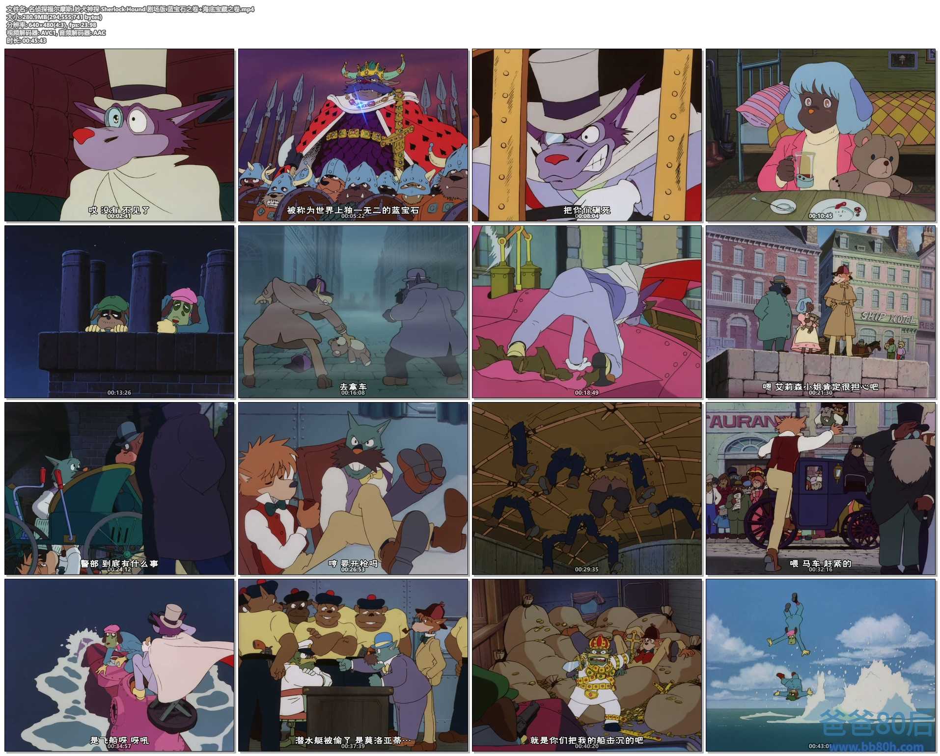 《妙犬神探》(又名《名侦探福尔摩斯》)是由宫崎骏参与执导,[日本东京电影新社与意大利广播电视公司(RAI)联合制作的电视动画,1984年11月26日至1985年5月20日在朝日电视台播出,全26集。该作改编自亚瑟·柯南·道尔的《福尔摩斯探案》,采用拟犬化角色设定,由广川太一郎、富田耕生等担任主要配音。动画以福尔摩斯与莫里亚蒂教授团伙的对抗为主线,弱化原著推理元素,强化机械发明与交通工具追逐场景,形成明快幽默的儿童向风格。莫里亚蒂作为主要反派,其部下托德、斯迈利频繁策划案件,固定由雷斯垂德探长展开调查。宫崎骏执导了其中6集(包含第2、4、5、12、17和26集),第5集《青之红玉》由其亲自操刀。