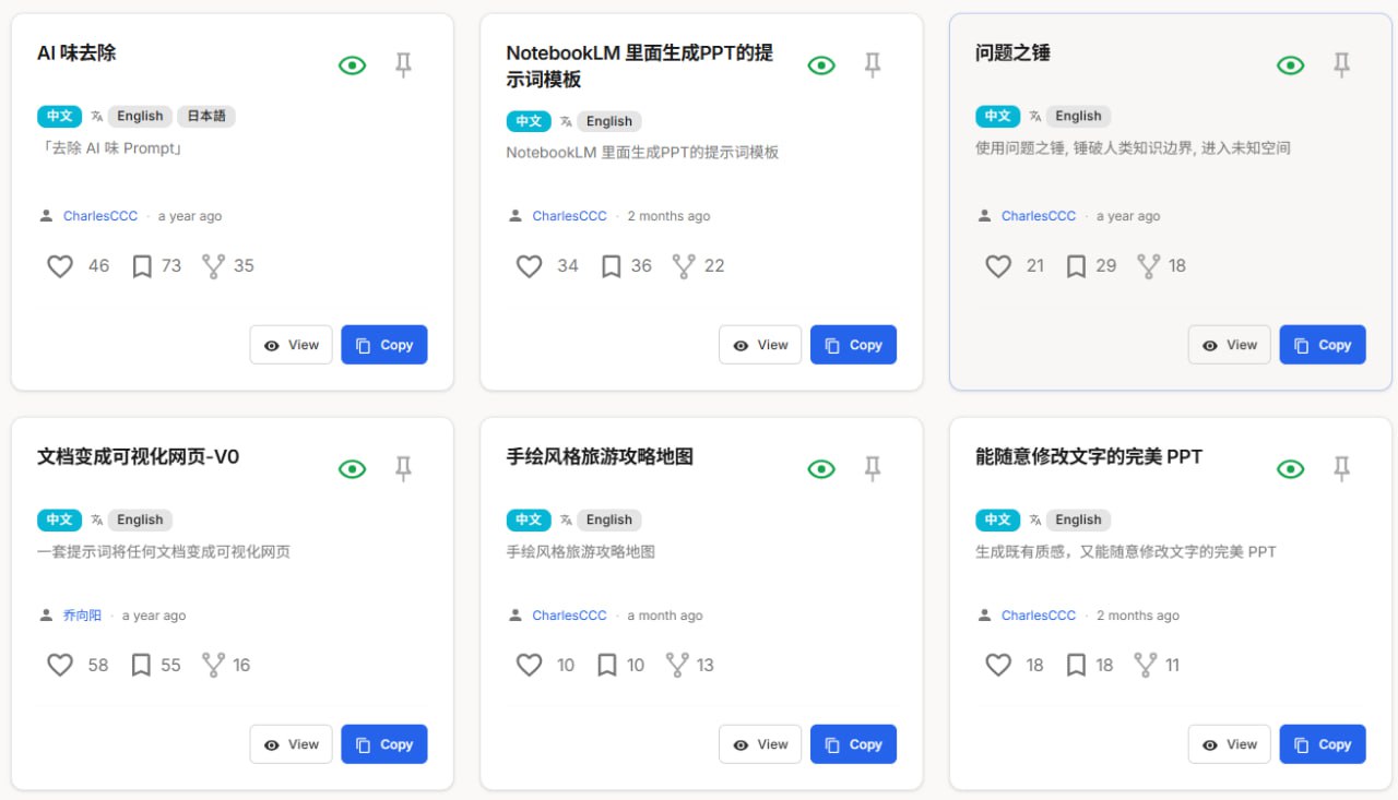 一个专注于组织、创建和分享AI提示词的网站。可以在该平台上轻松管理自己的提示词库,探索其他用户创作的提示词,并通过Markdown支持和语法高亮功能提升提示词的可读性和使用体验。 声明:本站所有文章,如无特殊说明或标注,均为本站原创发布。任何个人或组织,在未征得本站同意时,禁止复制、盗用、采集、发布本站内容到任何网站、书籍等各类媒体平台。如若本站内容侵犯了原著者的合法权益,可联系我们进行处理。