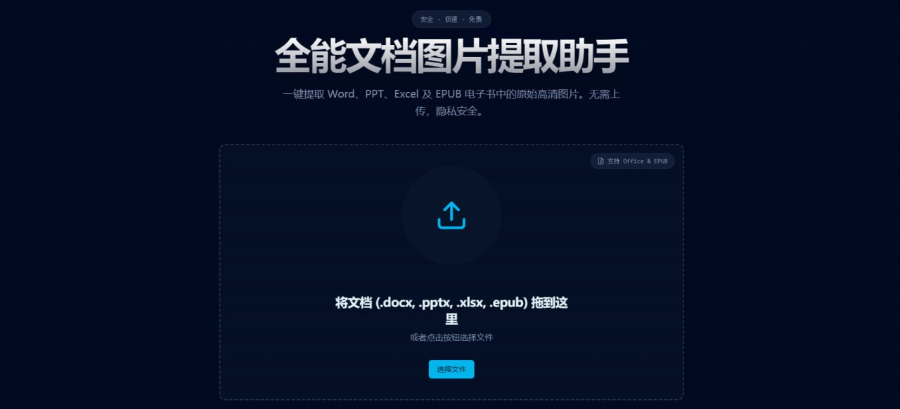 文档图片无损提取工具,可一键提取 Word、PPT、Excel 及 EPUB 电子书中的原始高清图片,支持单张下载或打包 ZIP 下载,完全本地化运行,免费使用,无需注册。 声明:本站所有文章,如无特殊说明或标注,均为本站原创发布。任何个人或组织,在未征得本站同意时,禁止复制、盗用、采集、发布本站内容到任何网站、书籍等各类媒体平台。如若本站内容侵犯了原著者的合法权益,可联系我们进行处理。